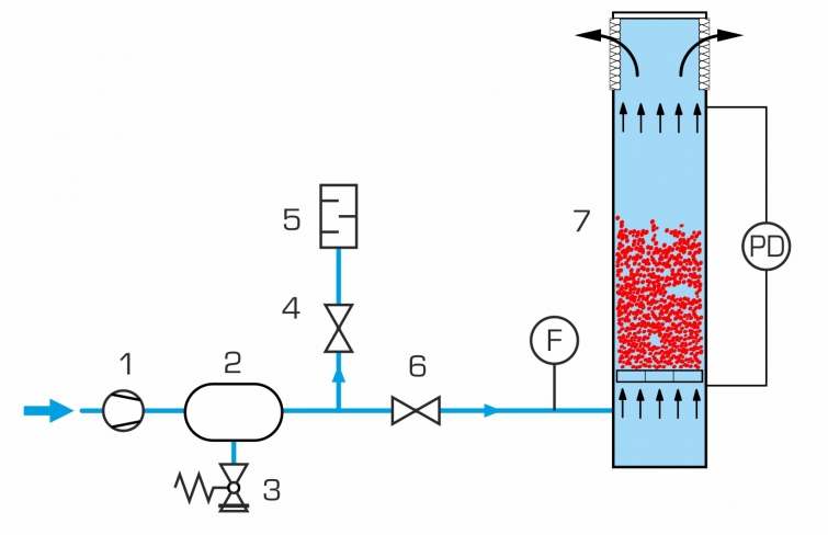 La phase solide en dispersion se trouvant au-dessus dune plaque frittée poreuse est traversée par le bas par la phase continue (eau ou air).