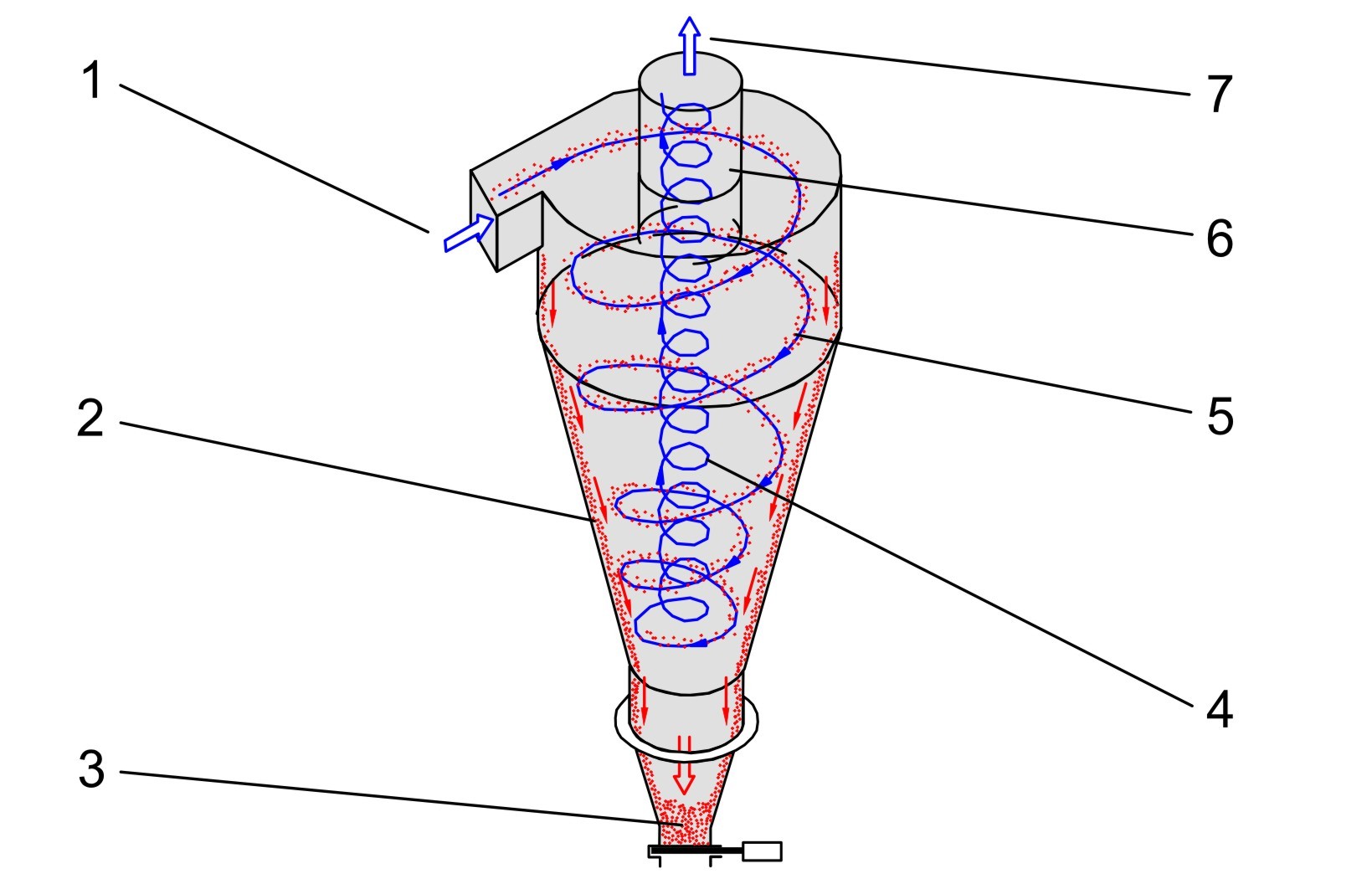 Idéalement, les fines particules dont la taille est inférieure au diamètre de coupure sortent en haut par le tube de sortie avec le tourbillon secondaire.
