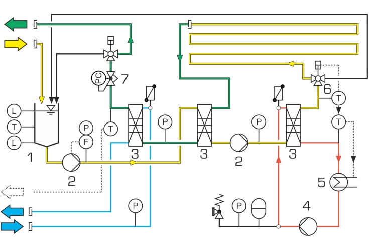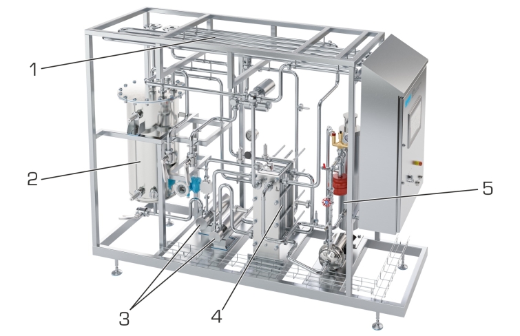 Linstallation dessai comprend un réservoir collecteur, deux pompes hygiéniques, un échangeur de chaleur à plaques avec trois compartiments, une section de maintien de la chaleur ainsi quun circuit deau de chauffage.