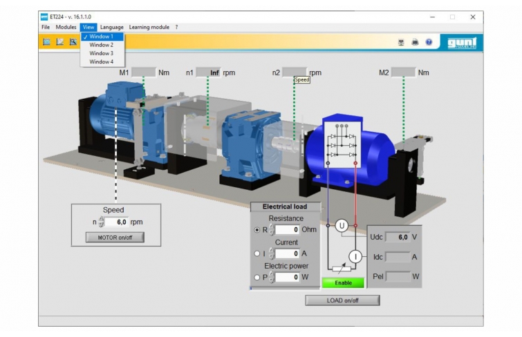 La vitesse de rotation du générateur ainsi que les couples côté entraînement et côté générateur sont mesurés par des capteurs et affichés numériquement dans le logiciel.