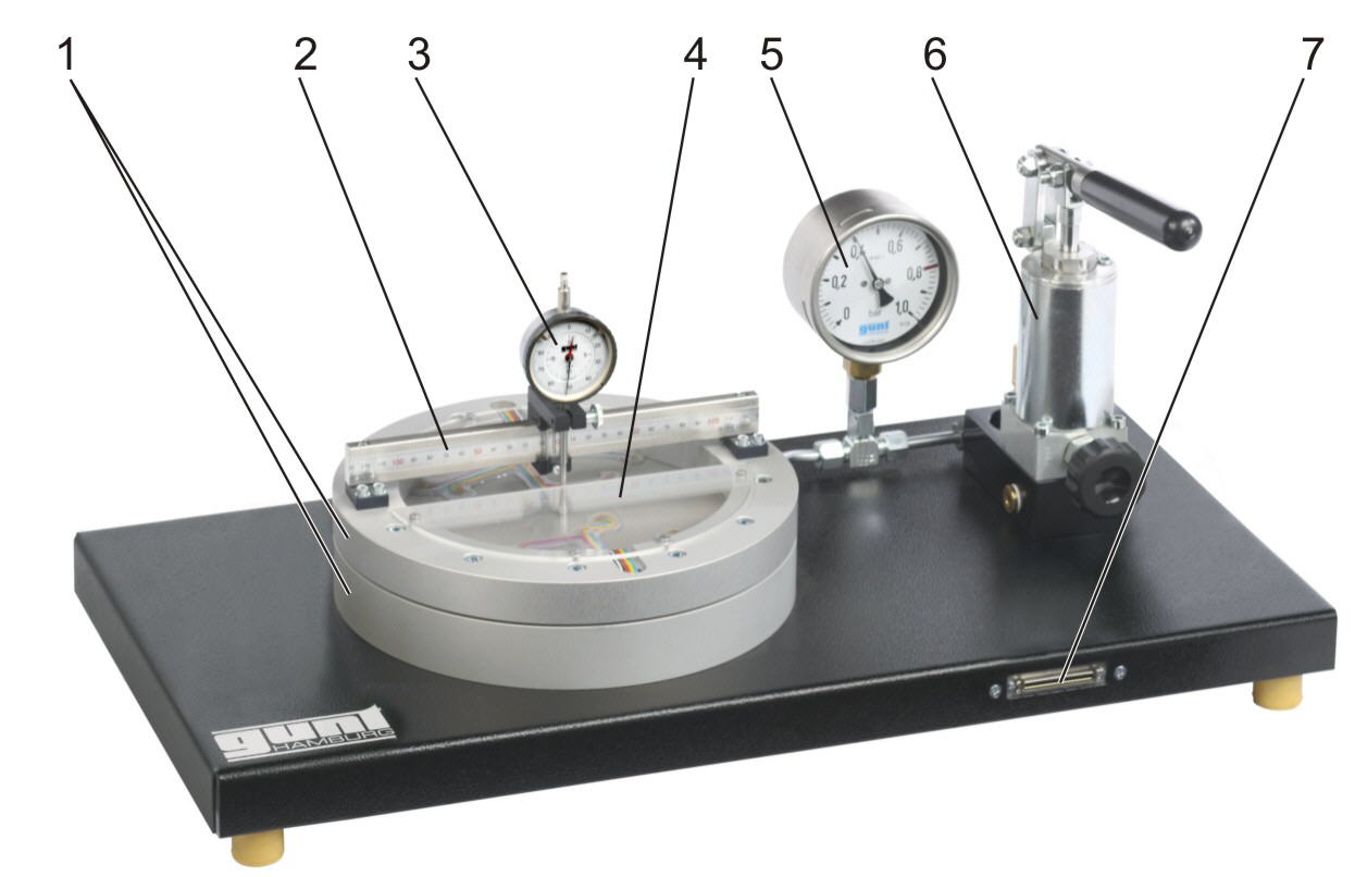 Lappareil dessai FL 120 permet de mesurer le fléchissement et la déformation dun disque circulaire soumis à différentes contraintes de compression.