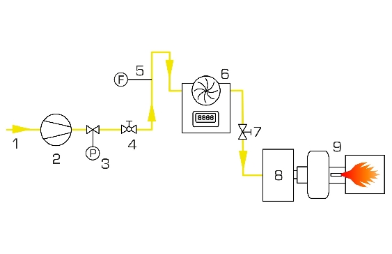 Le banc d'essai contient un brûleur à gaz à air soufflé du commerce.