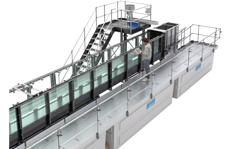 L'alimentateur est monté sur une estrade accessible installée à côté du canal d'essai.