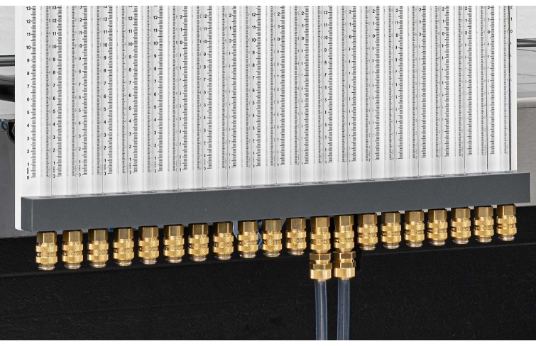 Il est possible d'utiliser plusieurs manomètres à dix tubes en même temps pour pouvoir afficher l'évolution de la profondeur de l'écoulement sur toute la longueur de la section d'essai.