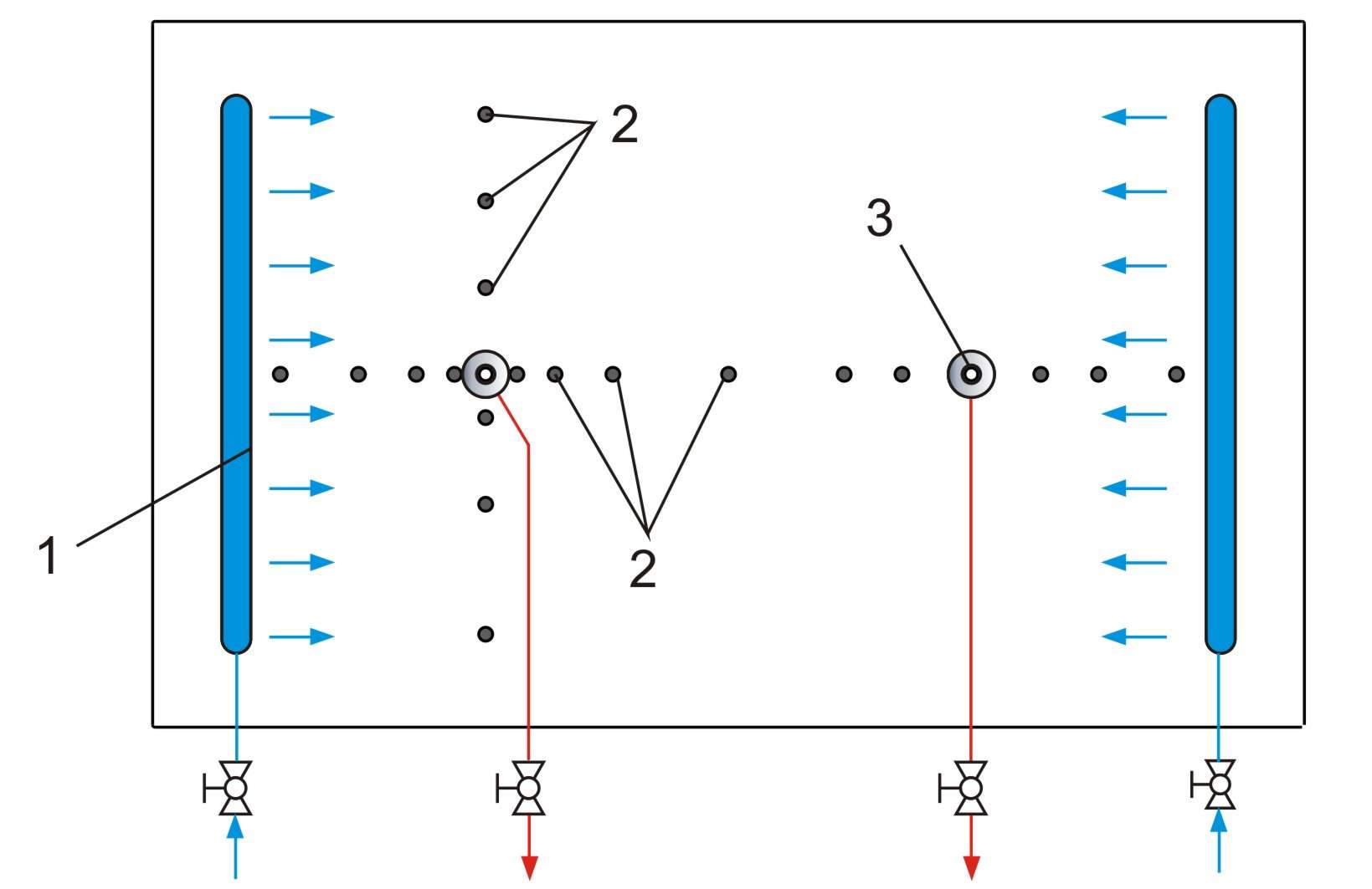 Le réservoir est alimenté en eau par l'intermédiaire de deux tuyaux fendus horizontaux pouvant être activées séparément au moyen de soupapes.