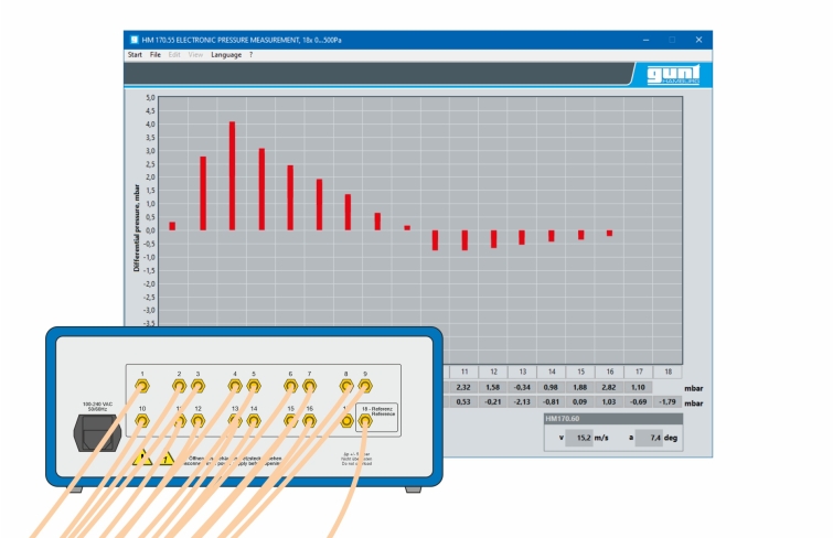 Les pressions statiques sont affichées sur le manomètre à tubes HM 170.50 ou dans la mesure électronique de la pression HM 170.55.