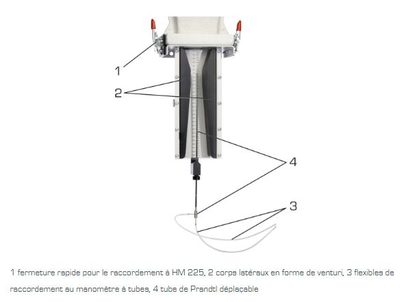 Pour représenter la distribution de la pression et de la vitesse, des valeurs de mesure peuvent être enregistrées au niveau de surfaces de section différentes en déplaçant le tube de Prandtl dans la direction de l'écoulement.