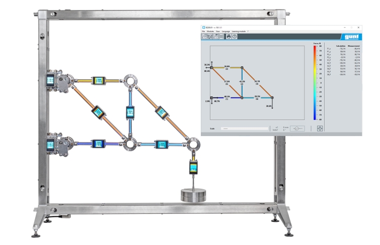 Dans le cadre des essais, toutes les forces du treillis plan (barres, appuis, charges) sont mesurées et représentées directement sur les composants intelligents ainsi que dans le logiciel GUNT sous forme de valeurs de mesure et de coloration.