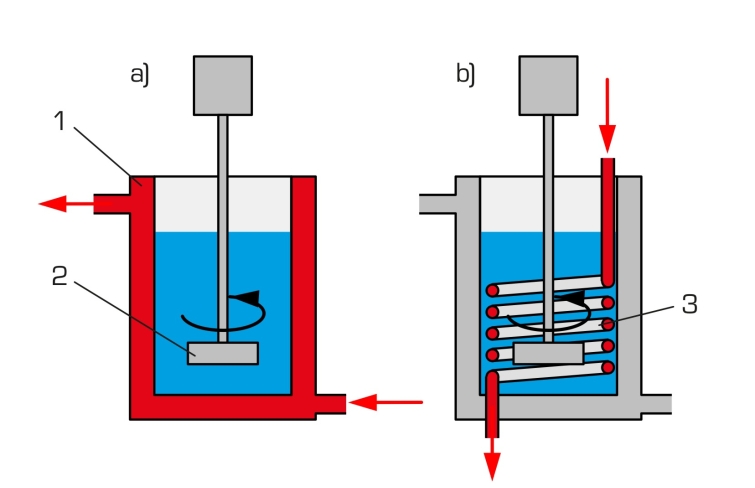 En fonction du procédé, le fluide dans la double enveloppe ou dans le serpentin est utilisé pour le chauffage ou le refroidissement du contenu du réservoir.