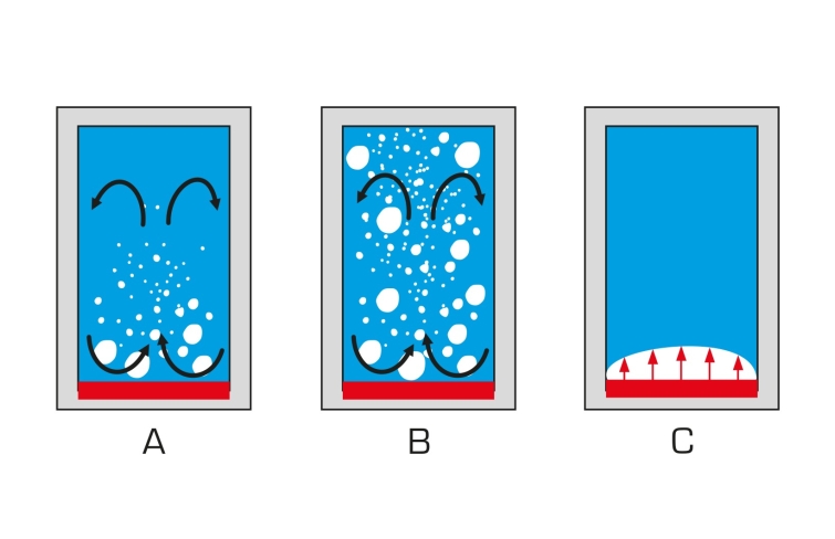 Lorsque lon chauffe un liquide sur une surface chauffante, des formes débullition différentes se forment en fonction de la densité de flux de chaleur.